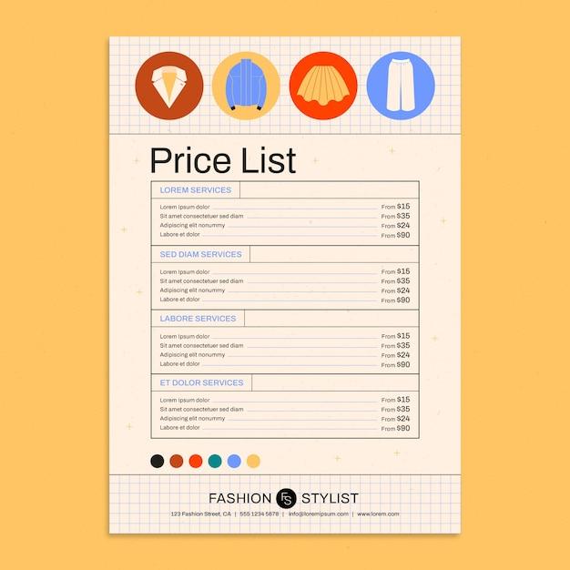 Flat design fashion stylist price list template